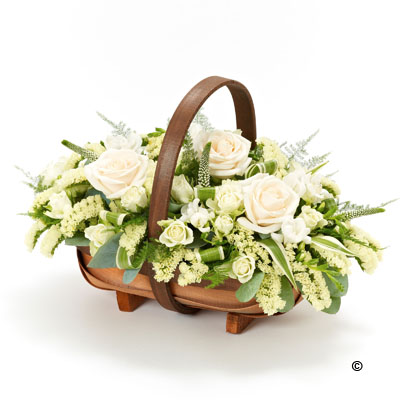 A traditional trug basket filled with roses, veronica, statice and scented freesias in fresh white with green foliage.A fabulous gift for any occasion.