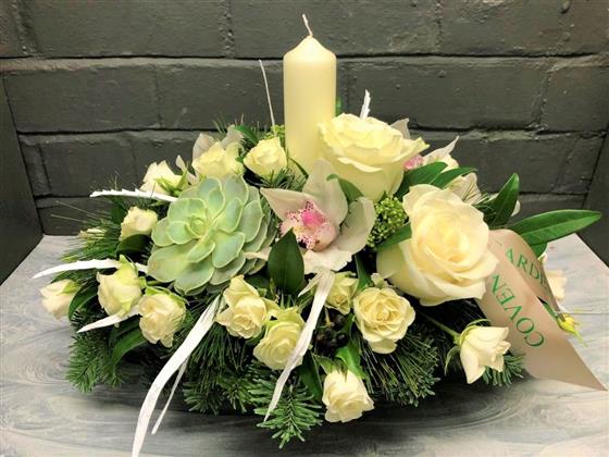 This luxury arrangement of white roses orchids and sedum to complement any dinner table.A Fantastic gift.