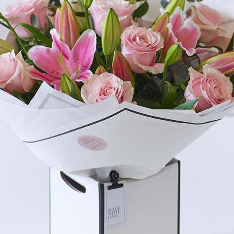 Think pink! A dreamy mix of pink roses and lilies. Incredibly charming.