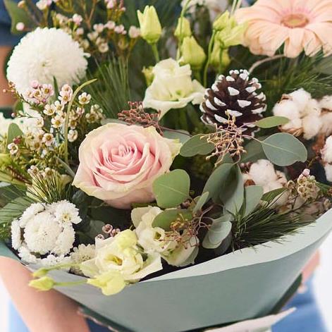 A striking bouquet of fresh and dried flowers in crisp, clean colours, chosen and arranged by the florist.