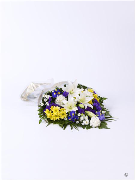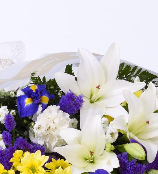 This sheaf of fresh flowers is simply arranged and presented wrapped and tied with a ribbon. The selection includes cream Asiatic Lily, blue iris, white carnations, yellow spray chrysanthemums, white September flowers and blue statice, hand-tied with leather leaf and palm leaves.