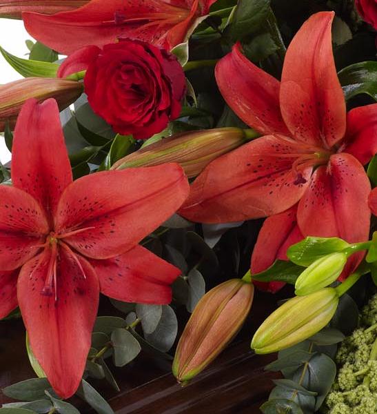 Beautiful Asiatic Lily and large-headed Rose red are used to create this elegant casket spray with trails of green amaranthus as well as ruscus, aralia leaves and eucalyptus.