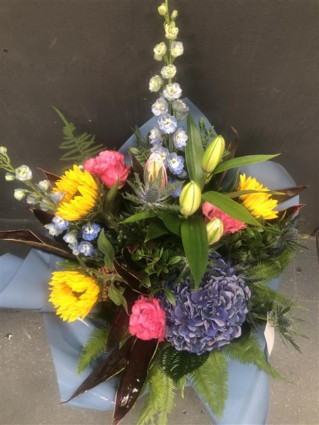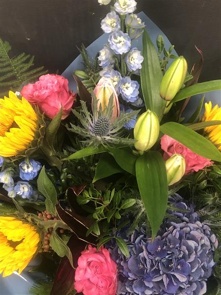 WOW , THIS IS AMAZING ,HYDRANGEA SUN FLOWERS , ROSES , DELPHINIUMS , LILY AND LUXURY FOLIAGE PRESENTED IN COVENT GARDEN PACKAGING.