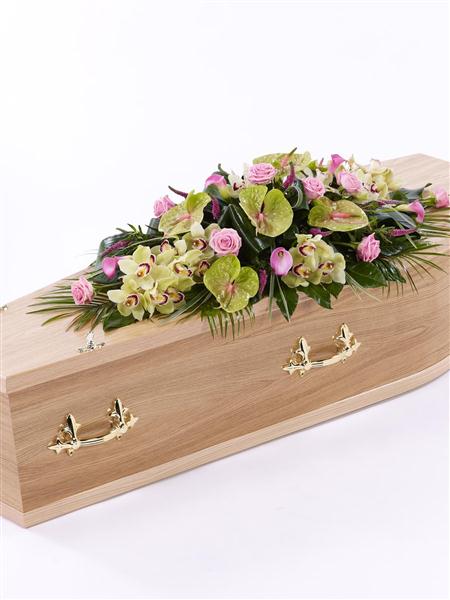 This distinctive casket spray brings together the soft green shades of cymbidium orchids and green anthurium, with delicate pink calla Lily, veronica and large-headed Rose. The spray is finished with aspidistra, aralia leaves, palm leaves and China grass.