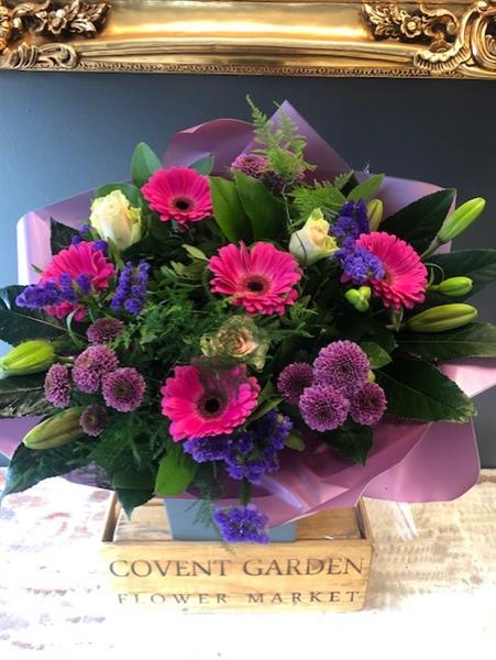 This bouquet is gift wrapped in cellophane and finished with a bow